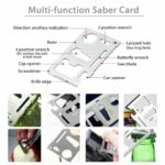 5. Saber Card: Credit card size, easy to fit in your wallet or bag. Can opener, cap opener, 4 position wrench, 2 position wrench, butterfly wrench, directional wrench, screwdriver, knife blade, saw blade, ruler, key chain, etc.